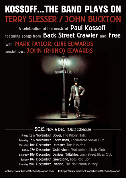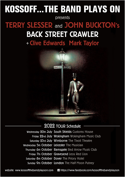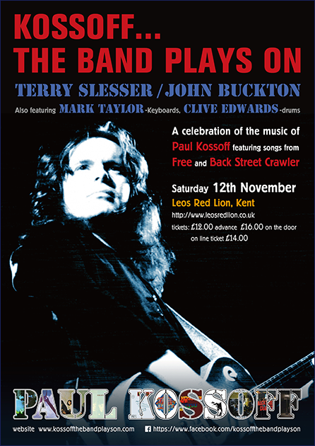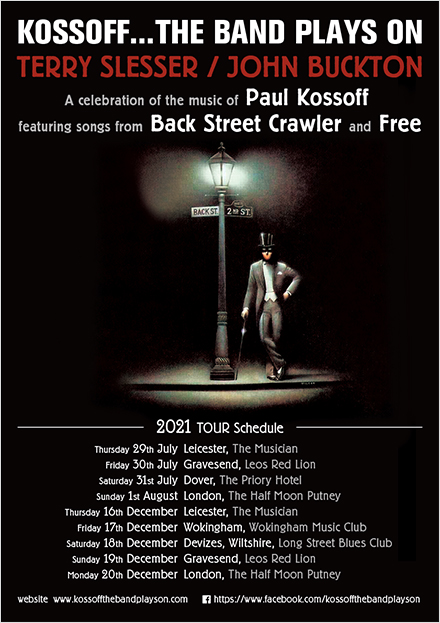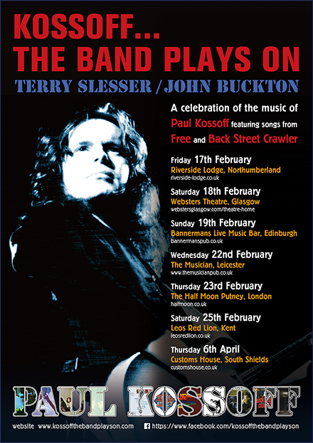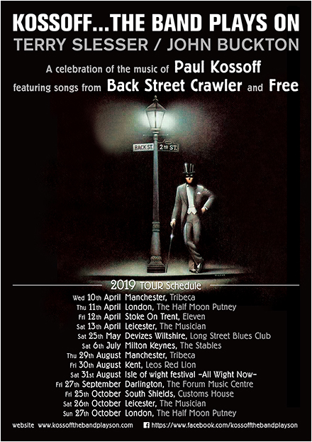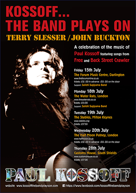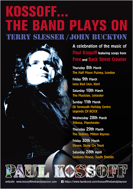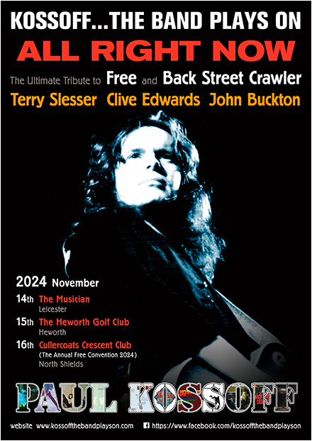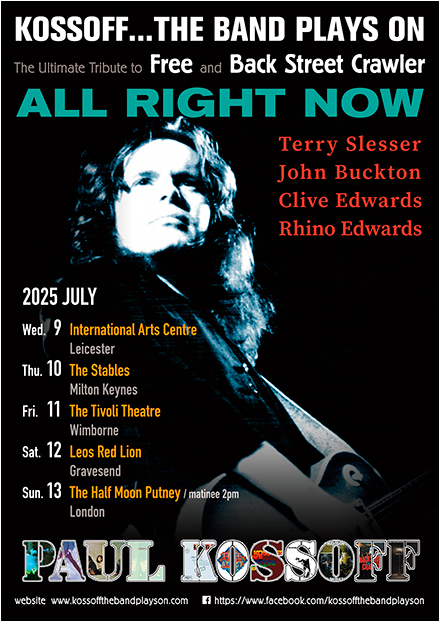 Kossoff: The Band Plays On are to mark Free’s performance at the 1969 festival. The band is fronted by Terry Slesser, founder member of Free guitarist Paul Kossoff’s final band Back Street Crawler. On guitar, John Buckton is regarded as the finest interpreter of Kossoff’s unique playing.