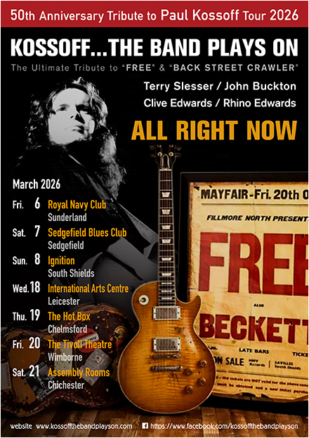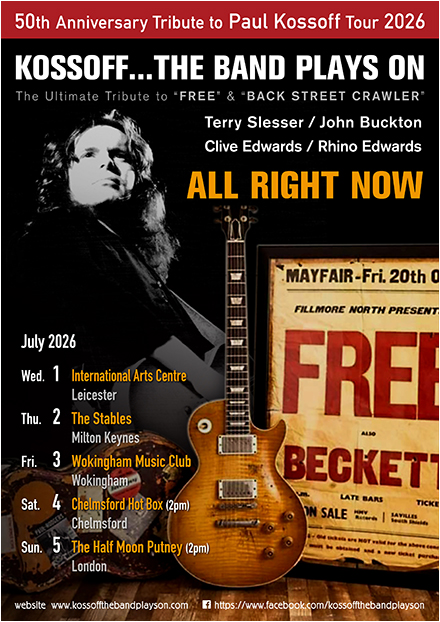 We have managed to secure a limited number of this fantastic book, a must for all fans of Paul Kossoff at a mega discounted price of £25 (RRP £49.99). All copies will be signed by the author and Terry Slesser ( and any other band members if requested) and will be either available for collection at our gigs or posted out prior (P&P charges incurred). For more information or to order please contact